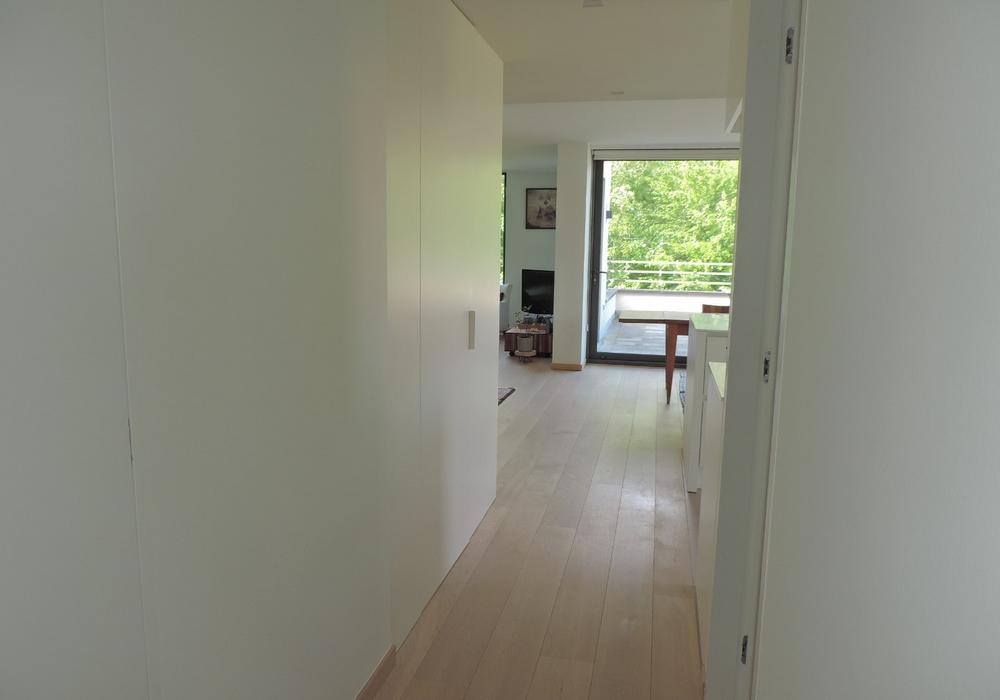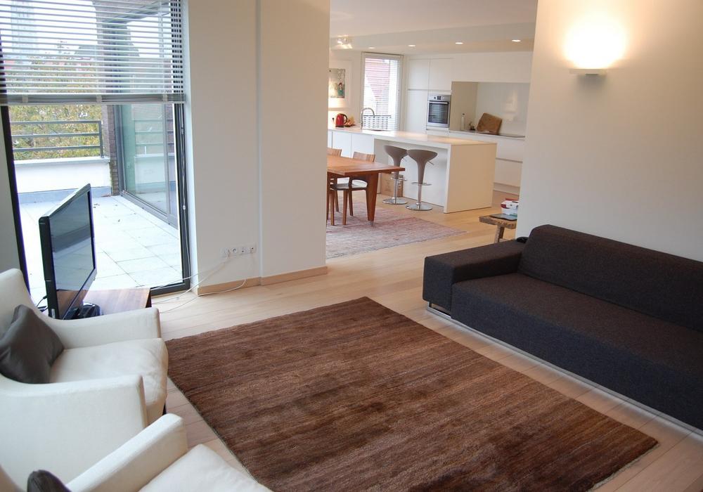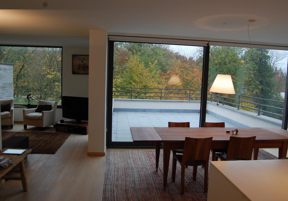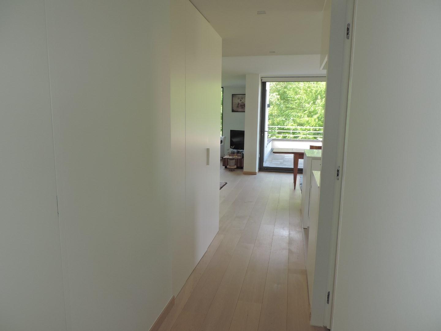 (parketvloeren, vloerverwarming, ingemaakte kasten, maatwerk, luxueuze keuken en badkamer met corian afwerking, etc). De vloei in het appartement is schitterend: alle ruimtes lopen en vloeien harmonieus in elkaar met telkens een verbluffend zicht op de omgeving vanwege de vele en grote raampartijen. Bovengrondse autostandplaats bij te huren € 75/maand.