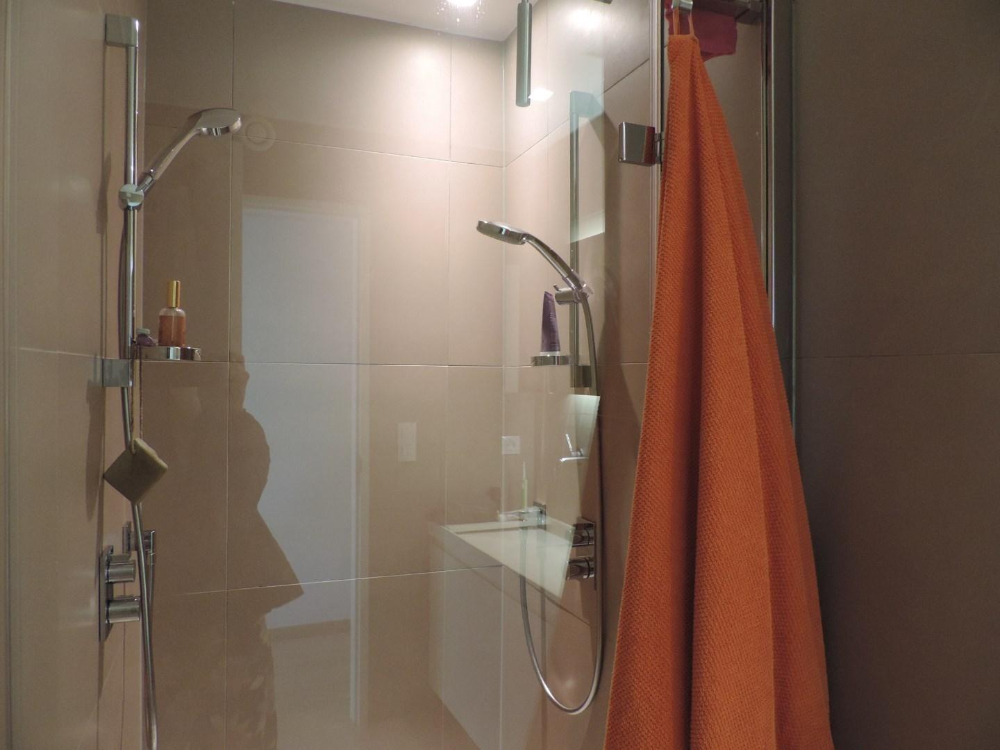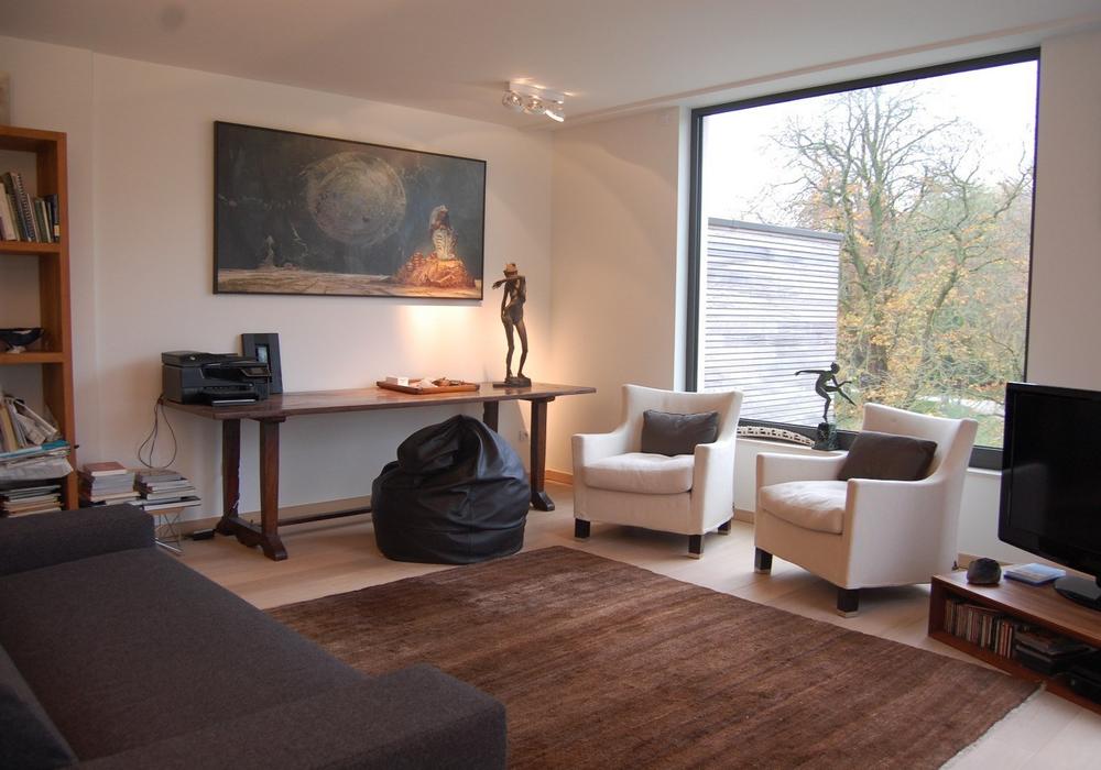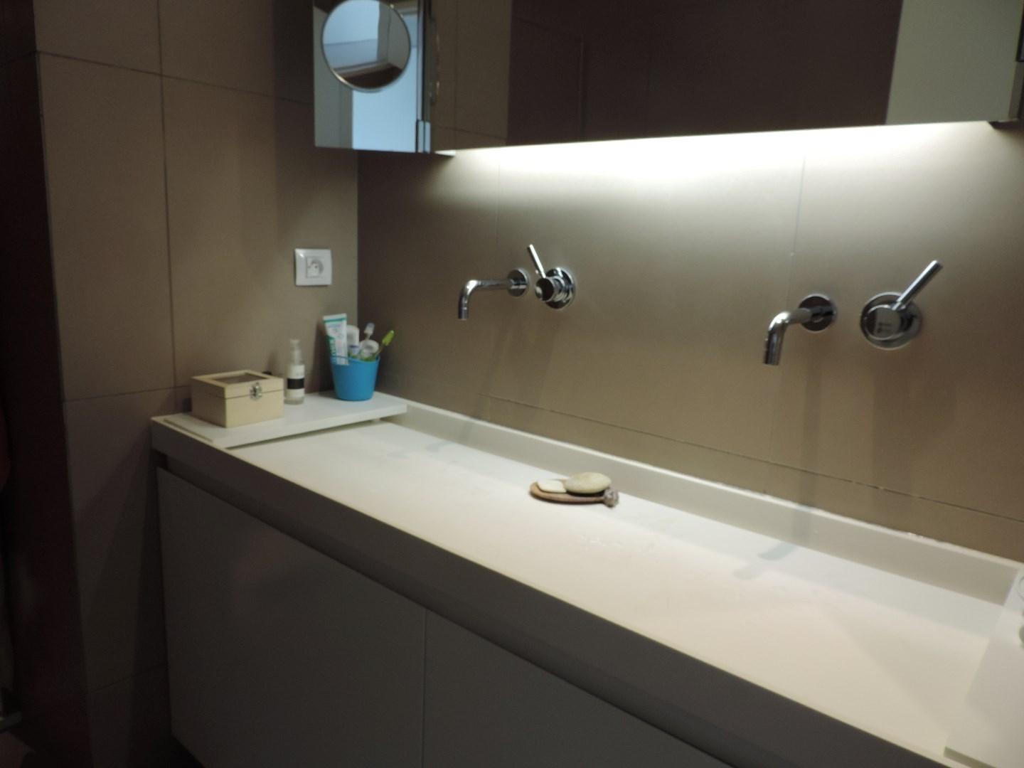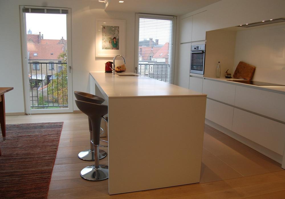 (parketvloeren, vloerverwarming, ingemaakte kasten, maatwerk, luxueuze keuken en badkamer met corian afwerking, etc). De vloei in het appartement is schitterend: alle ruimtes lopen en vloeien harmonieus in elkaar met telkens een verbluffend zicht op de omgeving vanwege de vele en grote raampartijen. Bovengrondse autostandplaats bij te huren € 75/maand.
