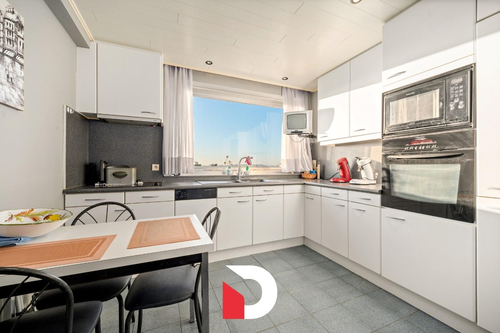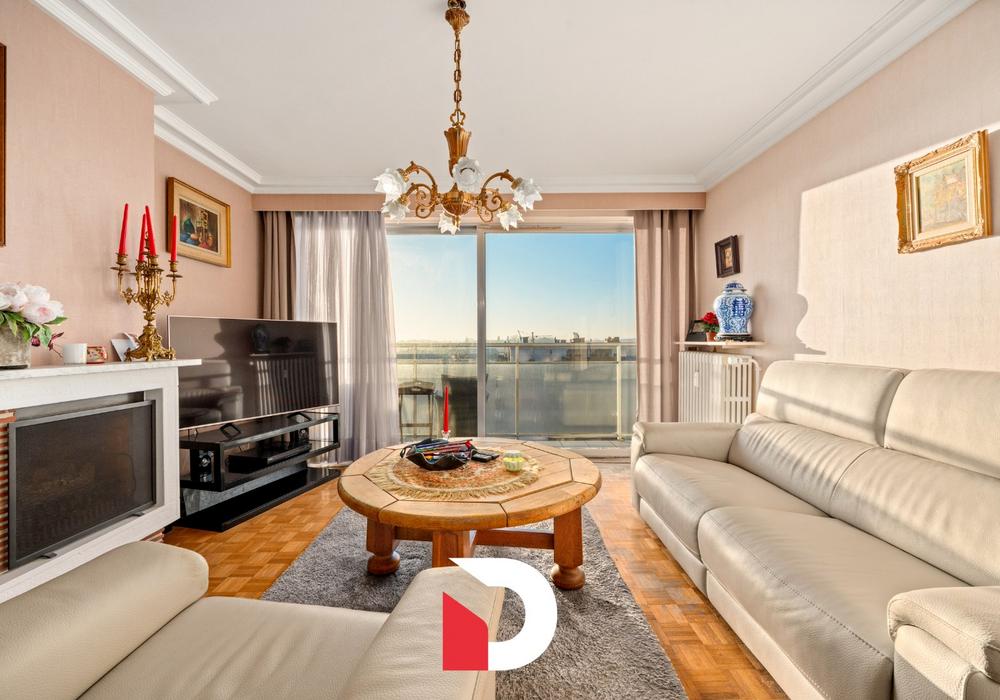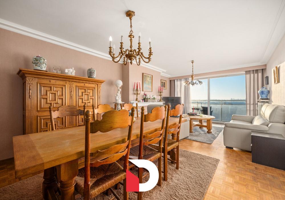 Het ruime appartement zelf (+/- 101 m²) geniet een verbluffend open zicht vanop de 6de verdieping voorzien van een zonnig terras. De leefruimtes zijn erg lichtrijk en voorzien van een parketvloer. Daarnaast is er een apart ingerichte leefkeuken voorzien van inbouwtoestellen, een badkamer, een toilet, ruime inkom met vestiairenis, 2 ruime slaapkamers, een spatieuze bergruimte/dressing en een balkon aan de achterzijde. Door de aanwezigheid van 2 terrassen, kan u de hele dag genieten van de zon!