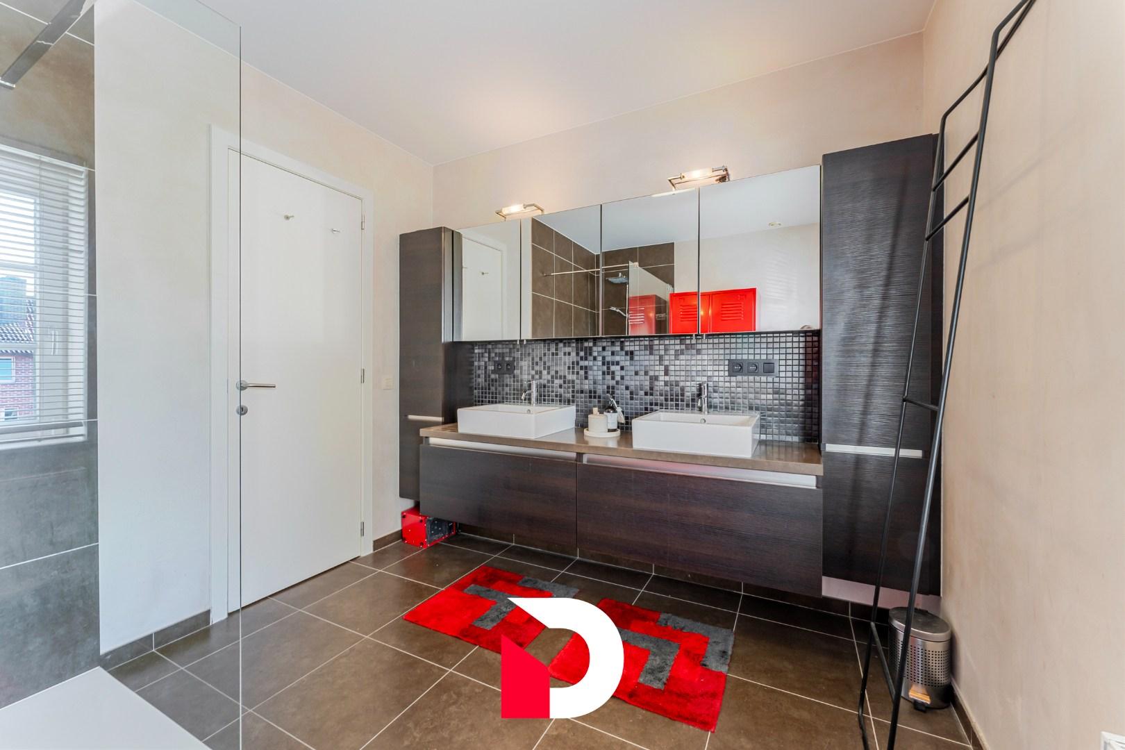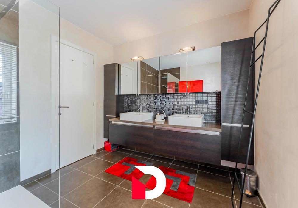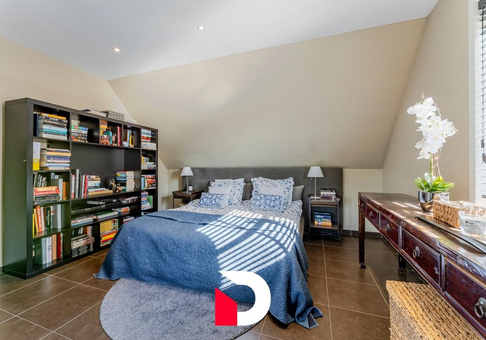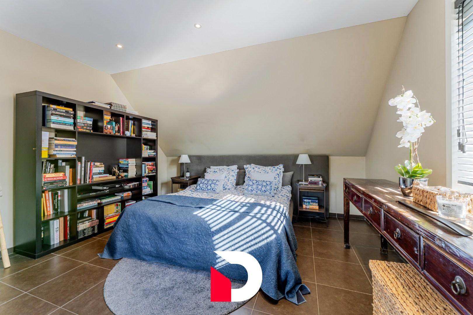 Op de eerste verdieping vinden we een riante overloop terug, masterbedroom met annex dressing (of mogelijkheid tot extra slaapkamer) en ruime badkamer.