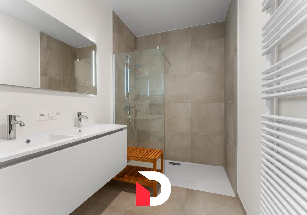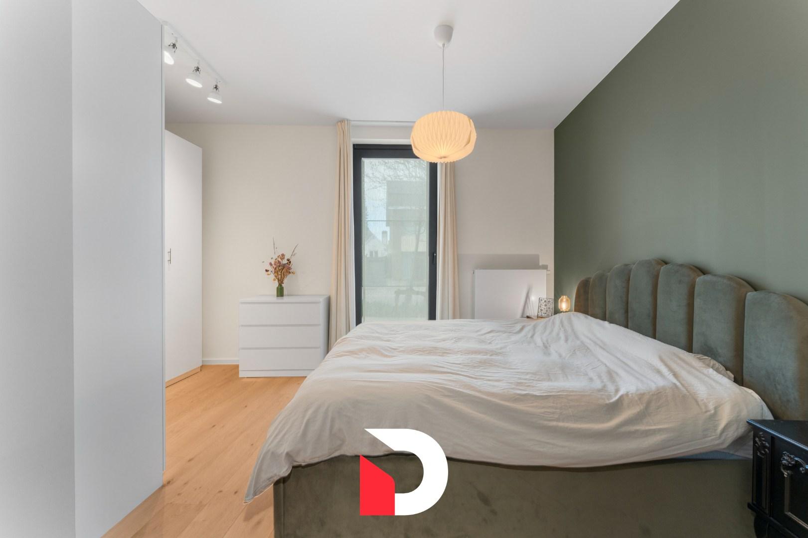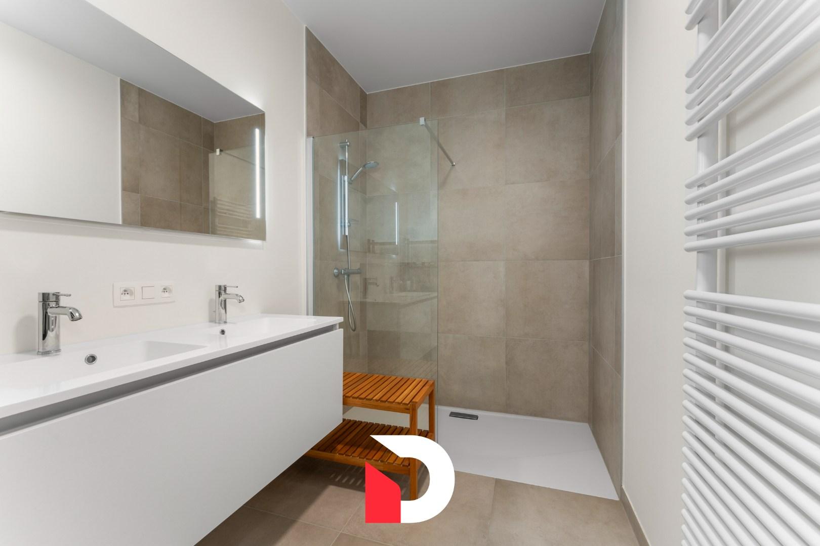 Het appartement beschikt over een riante slaapkamer (±16 m²) en een volledig uitgeruste badkamer met inloopdouche en dubbele lavabo. Daarnaast is er een afzonderlijk toilet in de hal.