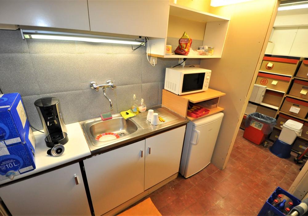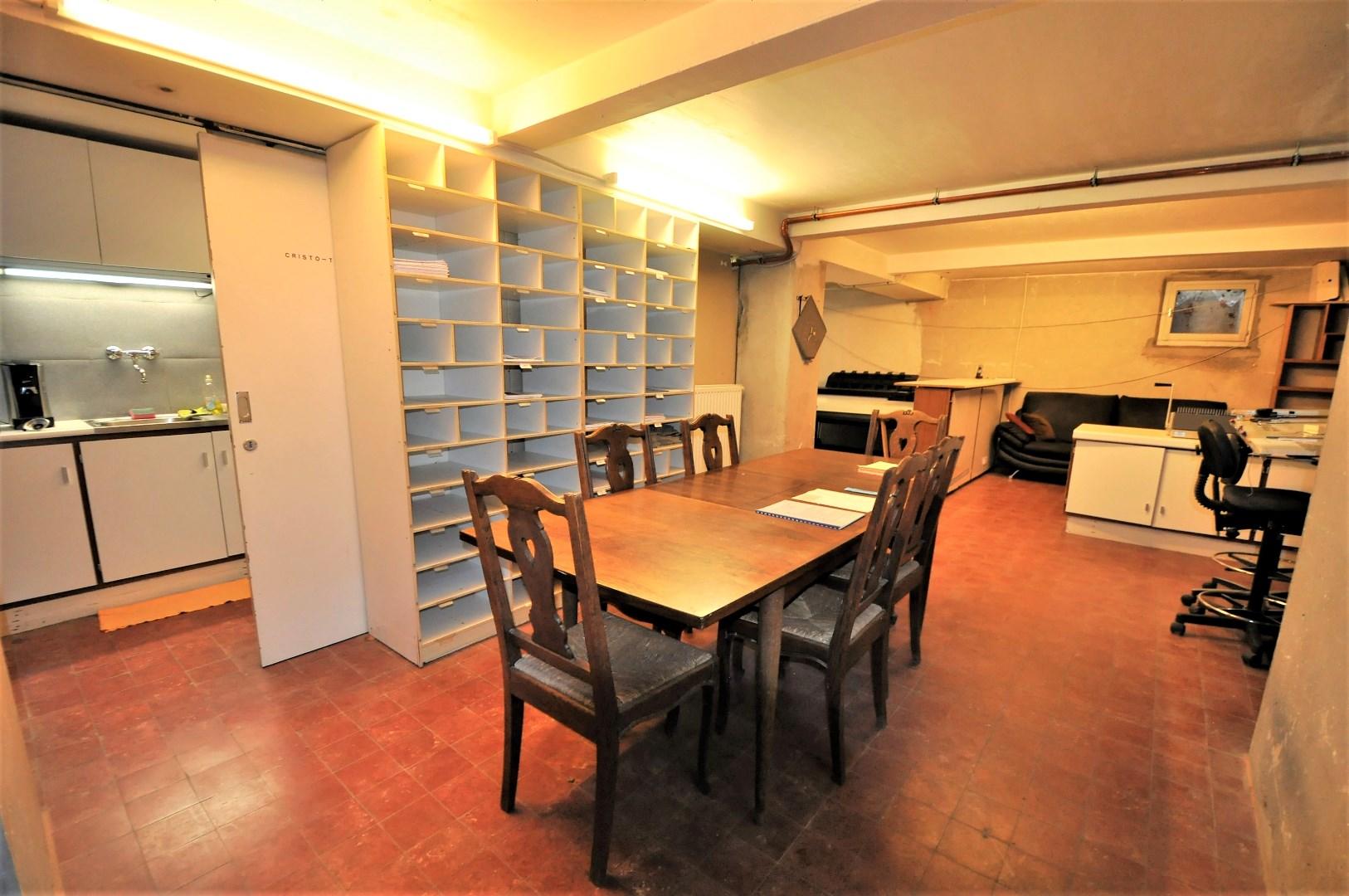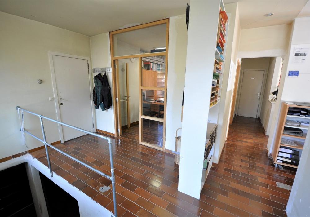 Daarnaast is er een vaste trap die toegang geeft tot een volwaardige kelderverdieping. Deze omvangrijke kelderverdieping meet +/- 86 m² en wordt momenteel gebruikt als kitchenette, vergaderruimte, polyvalente ontspanningsruimte, archief en printerlokaal.