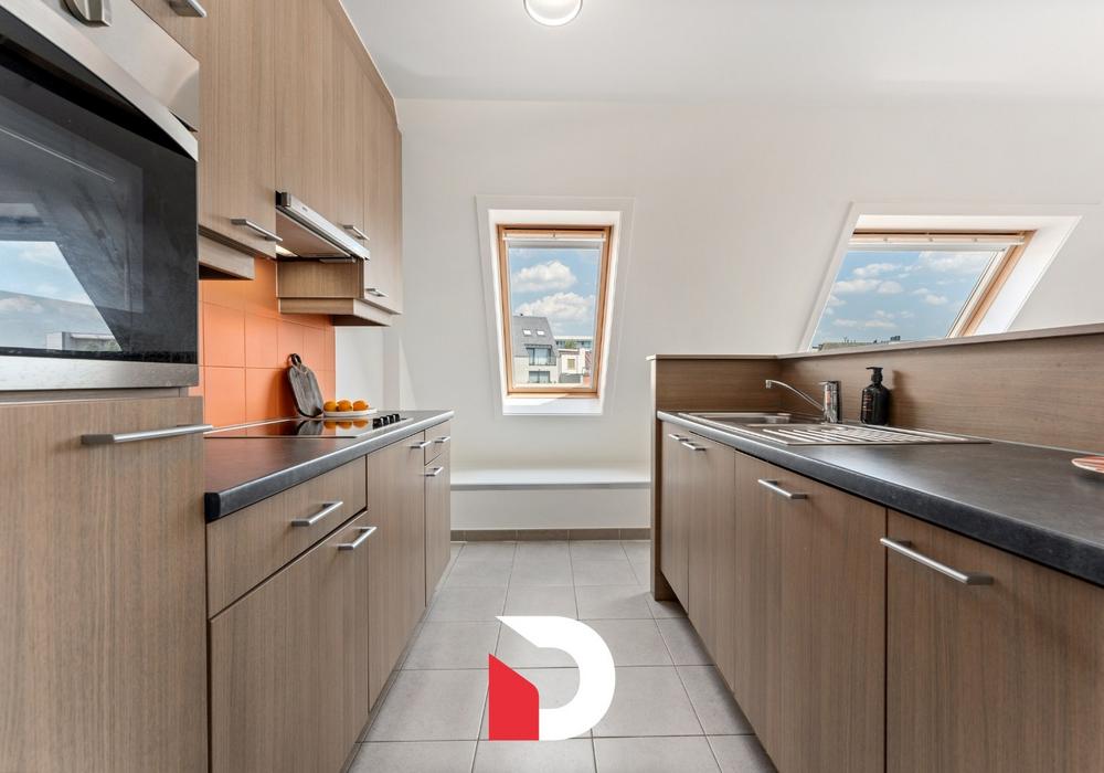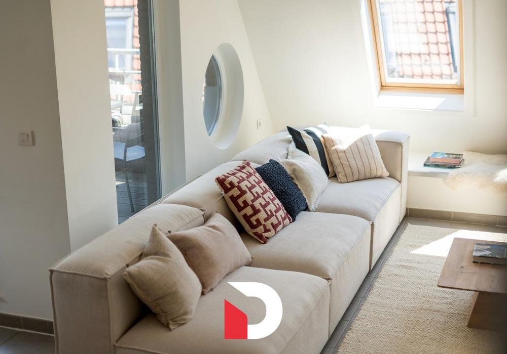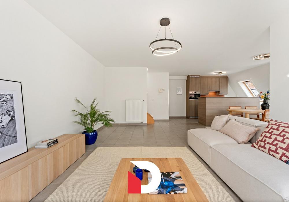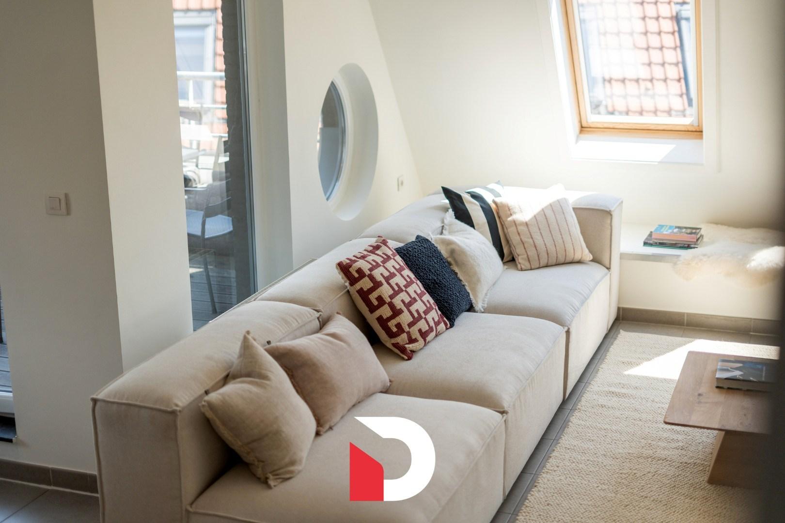 De lichtrijke leefruimte met open keuken vormt het hart van het appartement en geeft uit op een aangenaam terras – perfect om te genieten van een ontspannend moment in de zeelucht.
