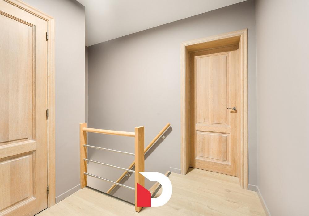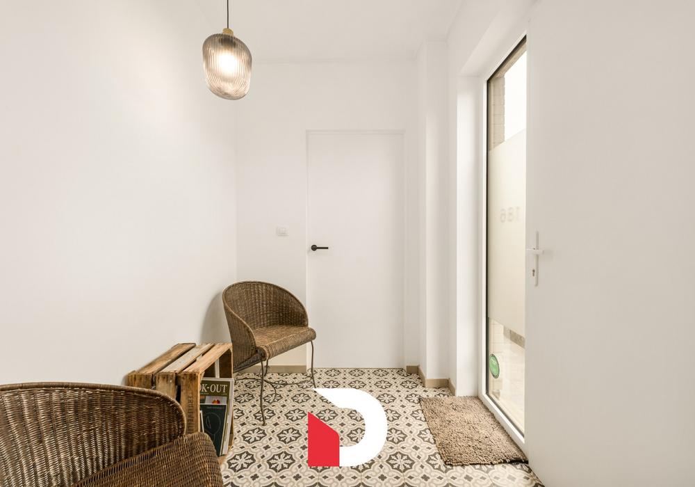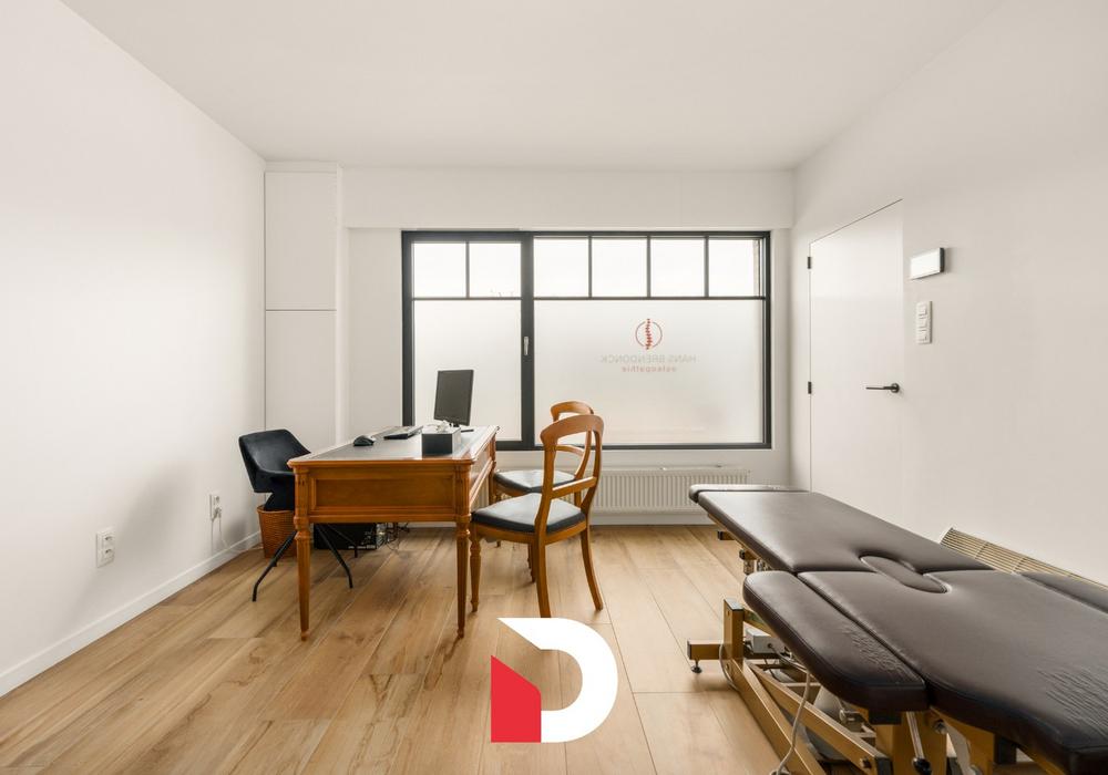Via een inkomhal komen we de woonst binnen, waarna we in het rechtse deel van de woonst een praktijkgedeelte met sanitair terugvinden (die perfect als bureel kan dienen).