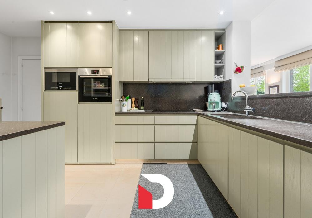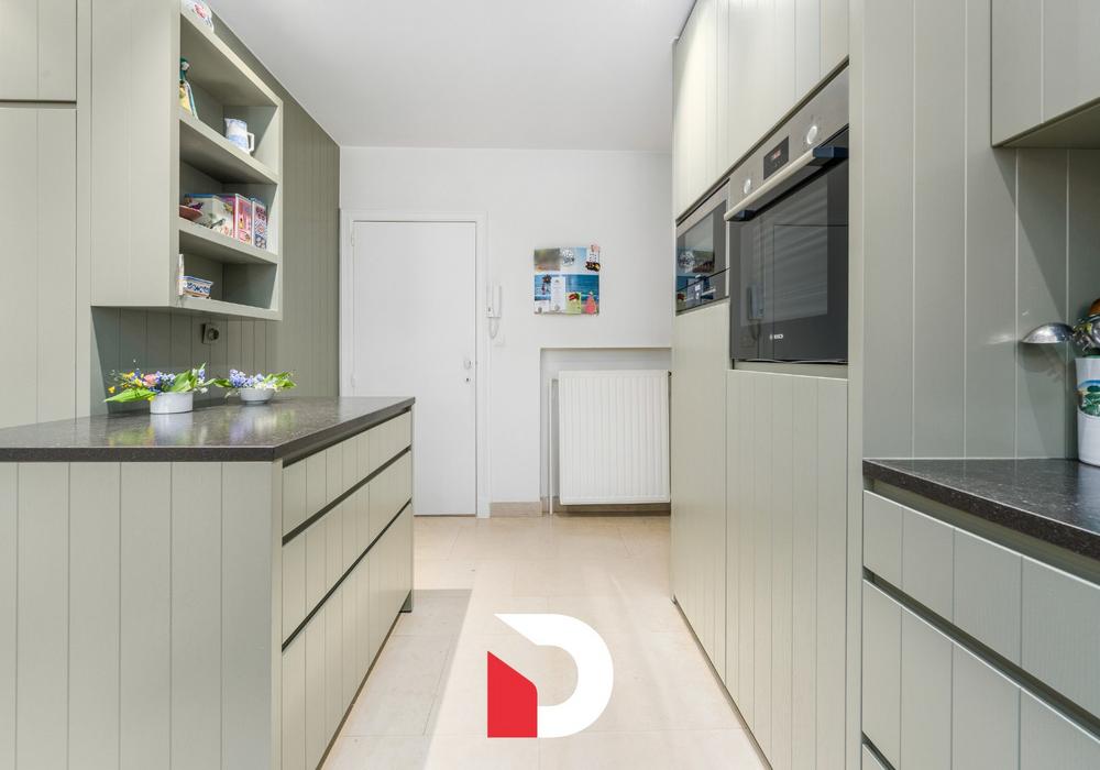 De woning beschikt op het gelijkvloers over een inkomhal, gezellige leefruimte die uit 2 zithoeken bestaat, overvloeiend in een eetplaats en via een half-open wand komen we in een smaakvolle keuken terecht. Deze ruime keuken werd voorzien van tal van maatwerk en inbouwtoestellen en zeer veel werkruimte.