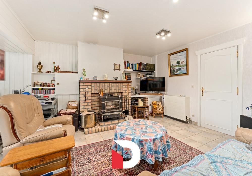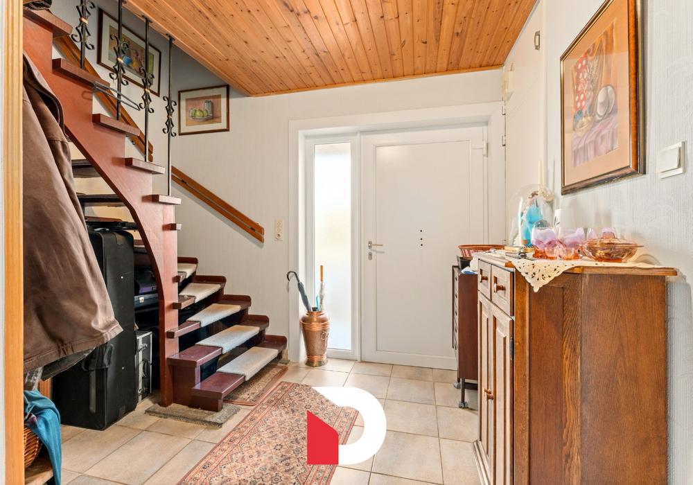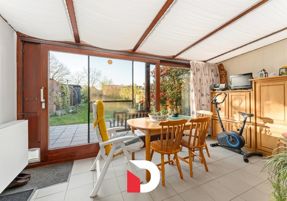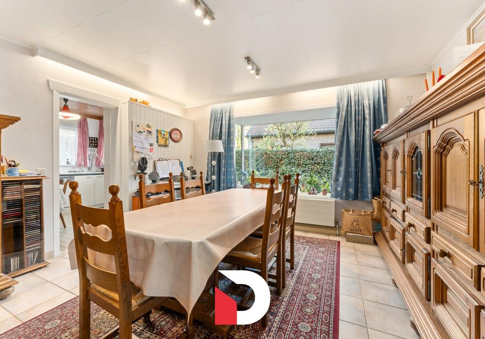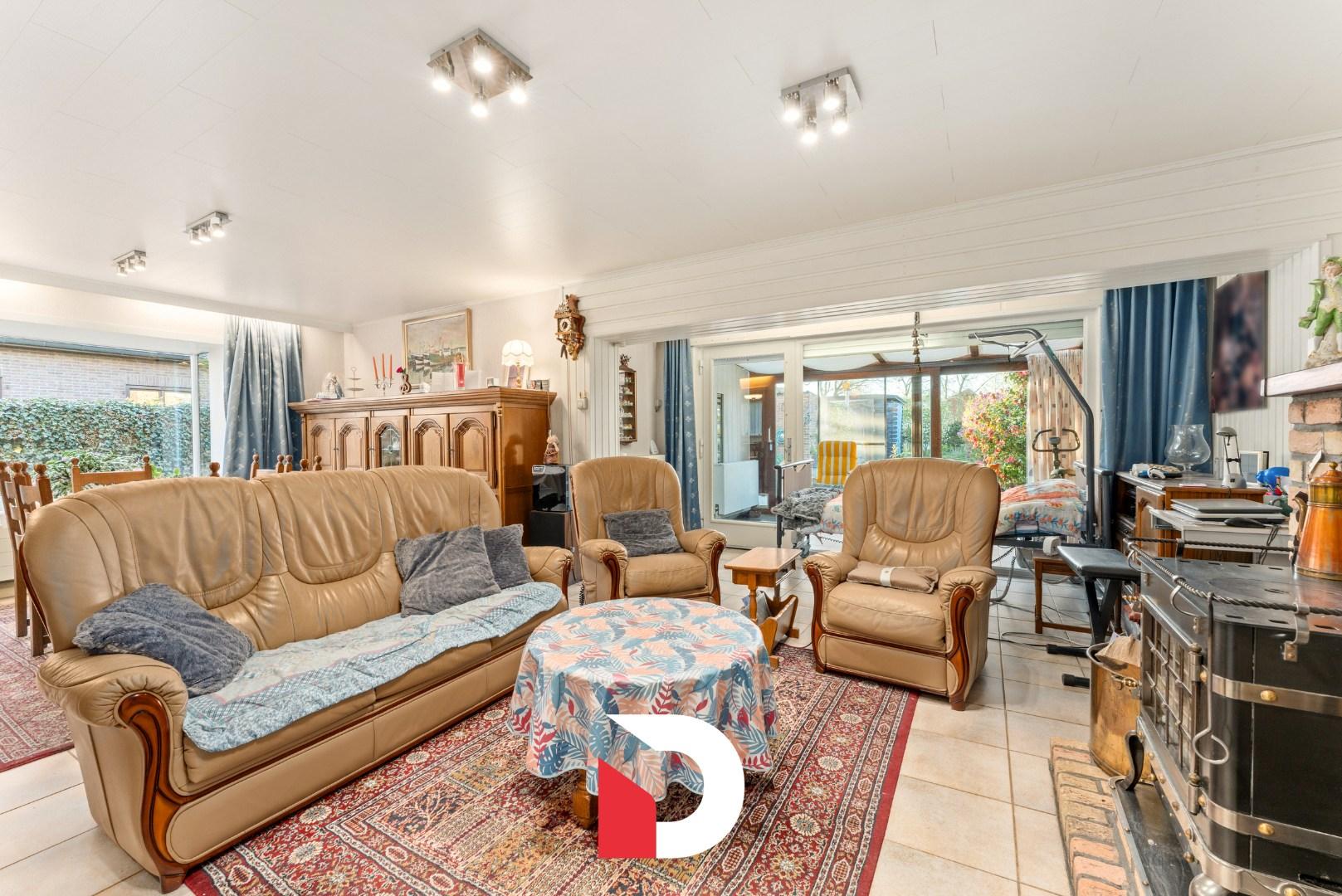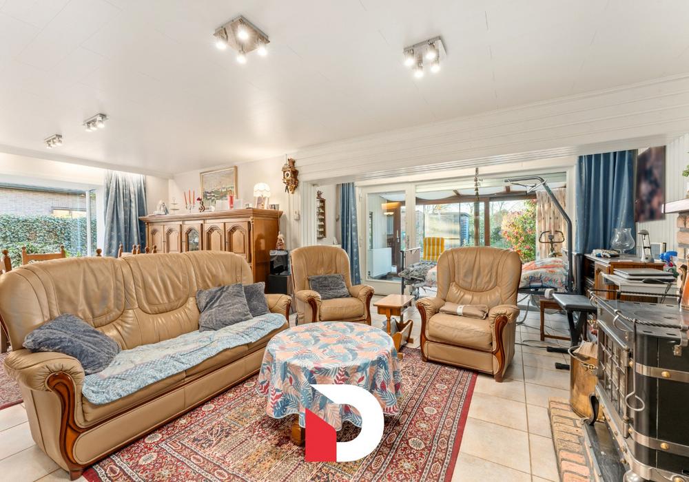 Hierbij een kleine rondleiding in deze praktische woonst: via de inkomhal komt u de spatieuze leefruimte binnen die op vandaag opgesplitst is in een gezellige zithoek en eethoek. De salonhoek vloeit over in een veranda waar een tweede zithoek werd gecreëerd die frontaal uitkijkt op de riante tuin met terras.
